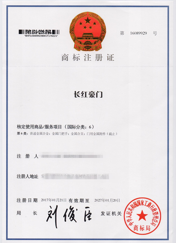 第6类“长红豪门”商标注册证