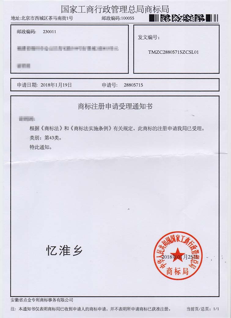 第43类“忆淮乡”商标受理通知书