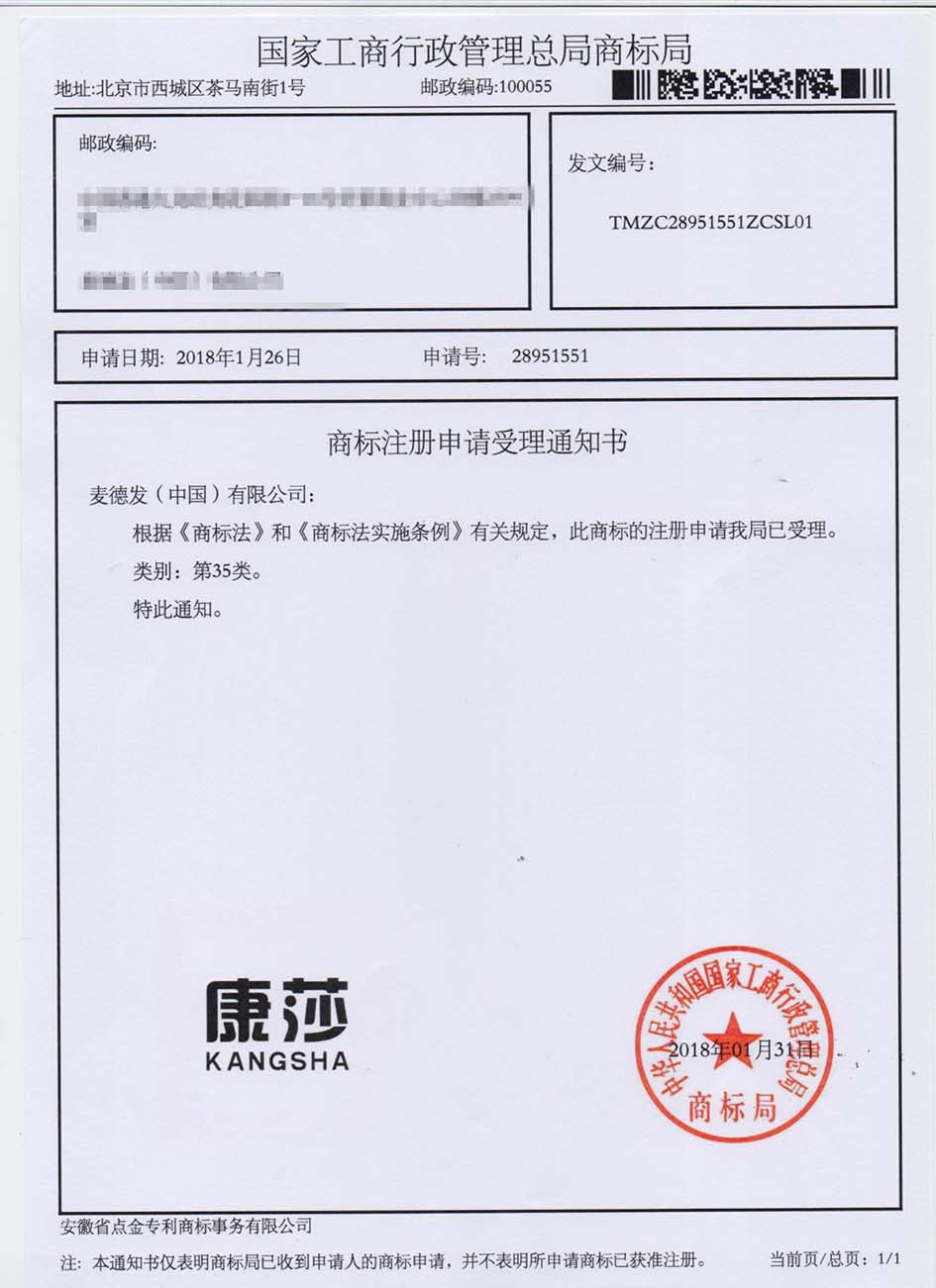 第35类“康莎”商标受理通知书