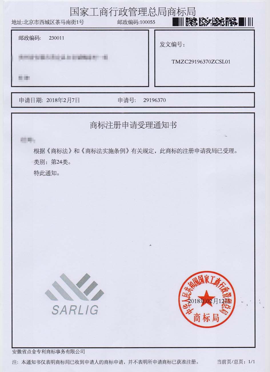 第24类“SARLIG”商标受理通知书