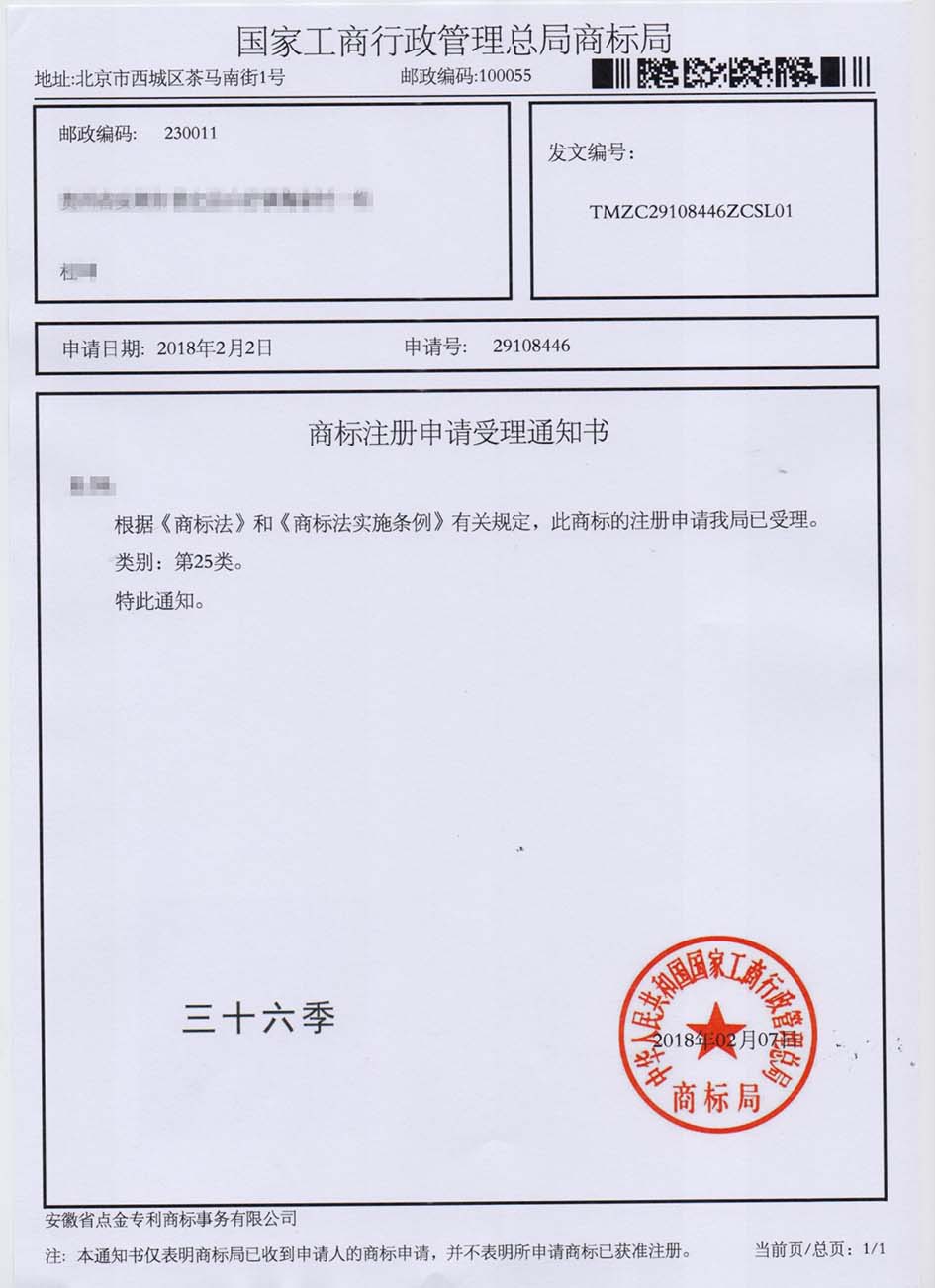 第25类“三十六季”商标受理通知书