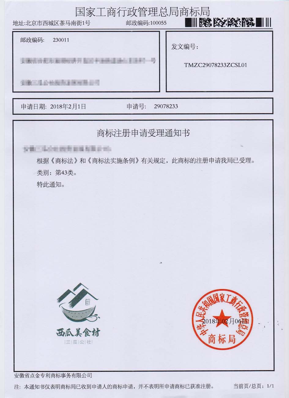 第43类“西瓜美食村”商标受理通知书