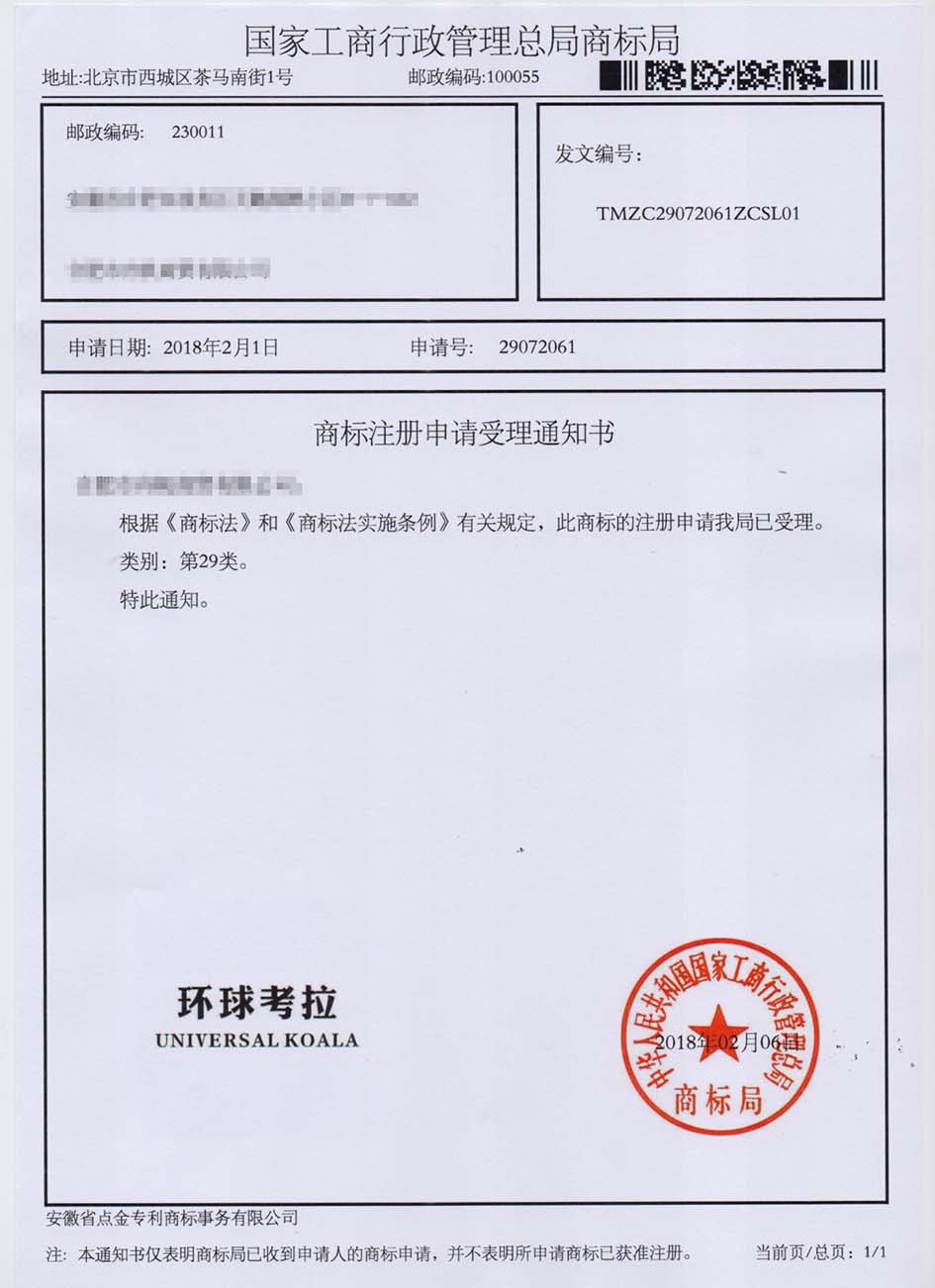 第29类“环球考拉”商标受理通知书