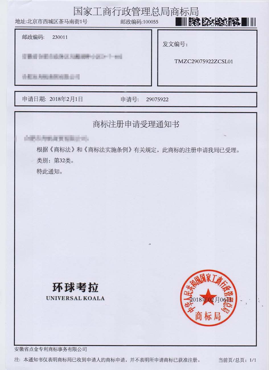 第32类“环球考拉”商标受理通知书