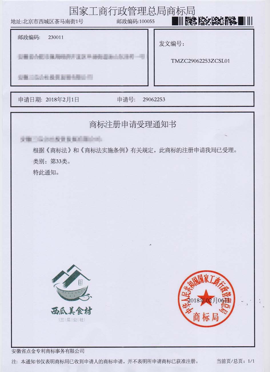 第33类“西瓜美食村”商标受理通知书