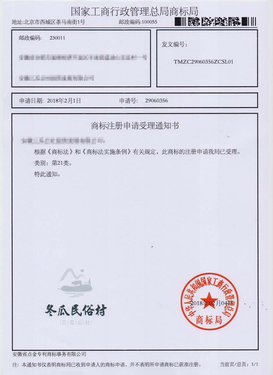 第21类“冬瓜民俗村”商标受理通知书