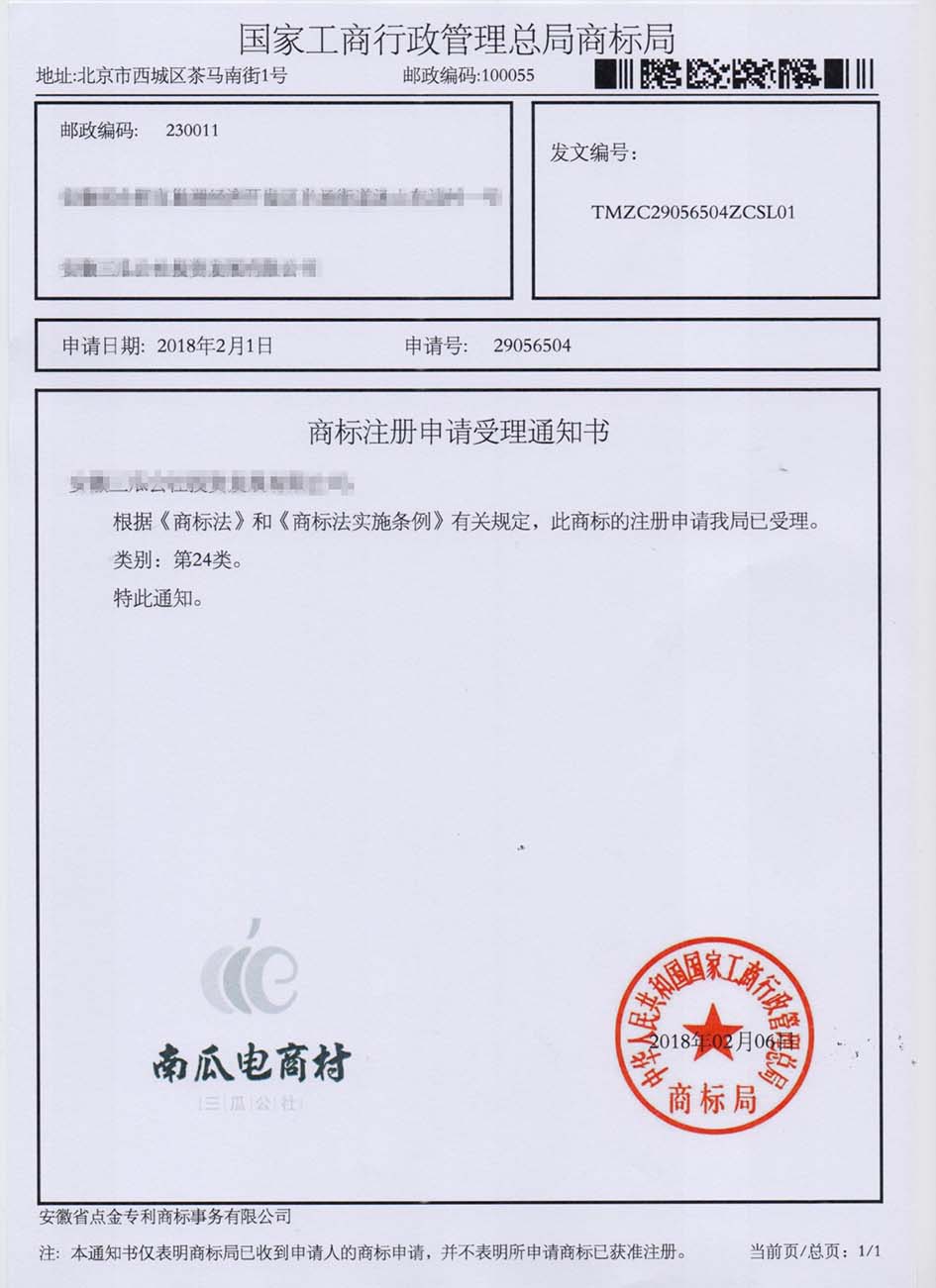 第24类“西瓜电商村”商标受理通知书