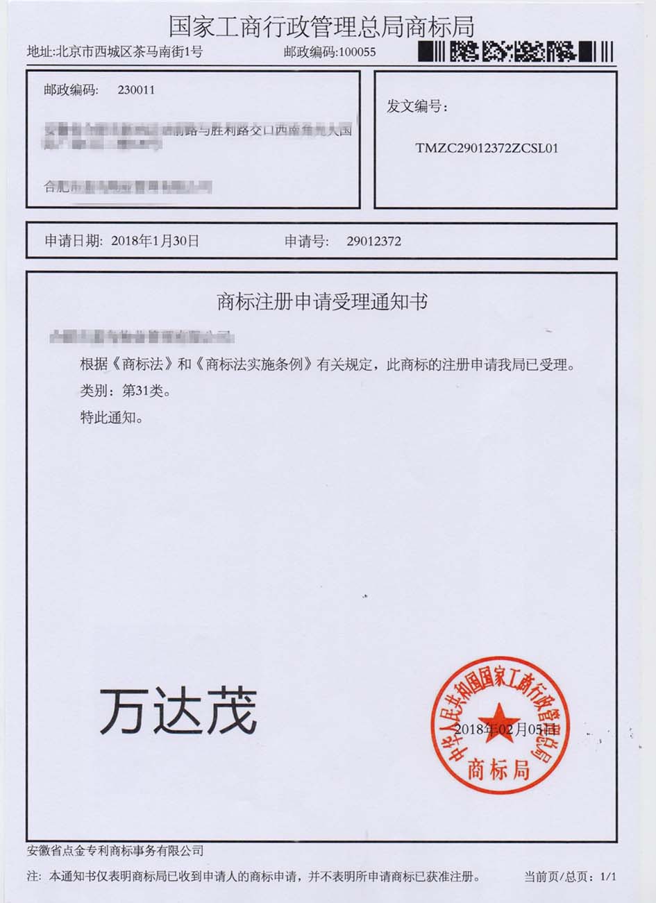 第31类“万达茂”商标受理通知书