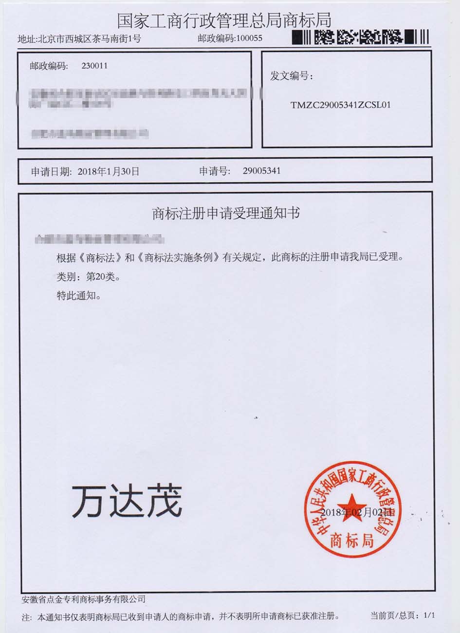 第20类“万达茂”商标受理通知书
