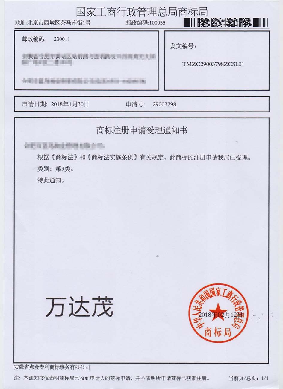 第3类“万达茂”商标受理通知书