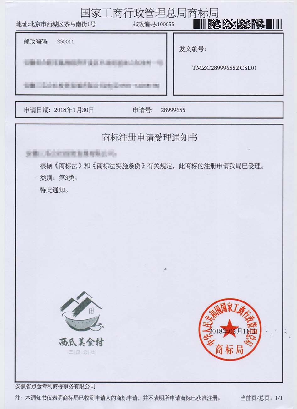 第3类“西瓜美食村”商标受理通知书