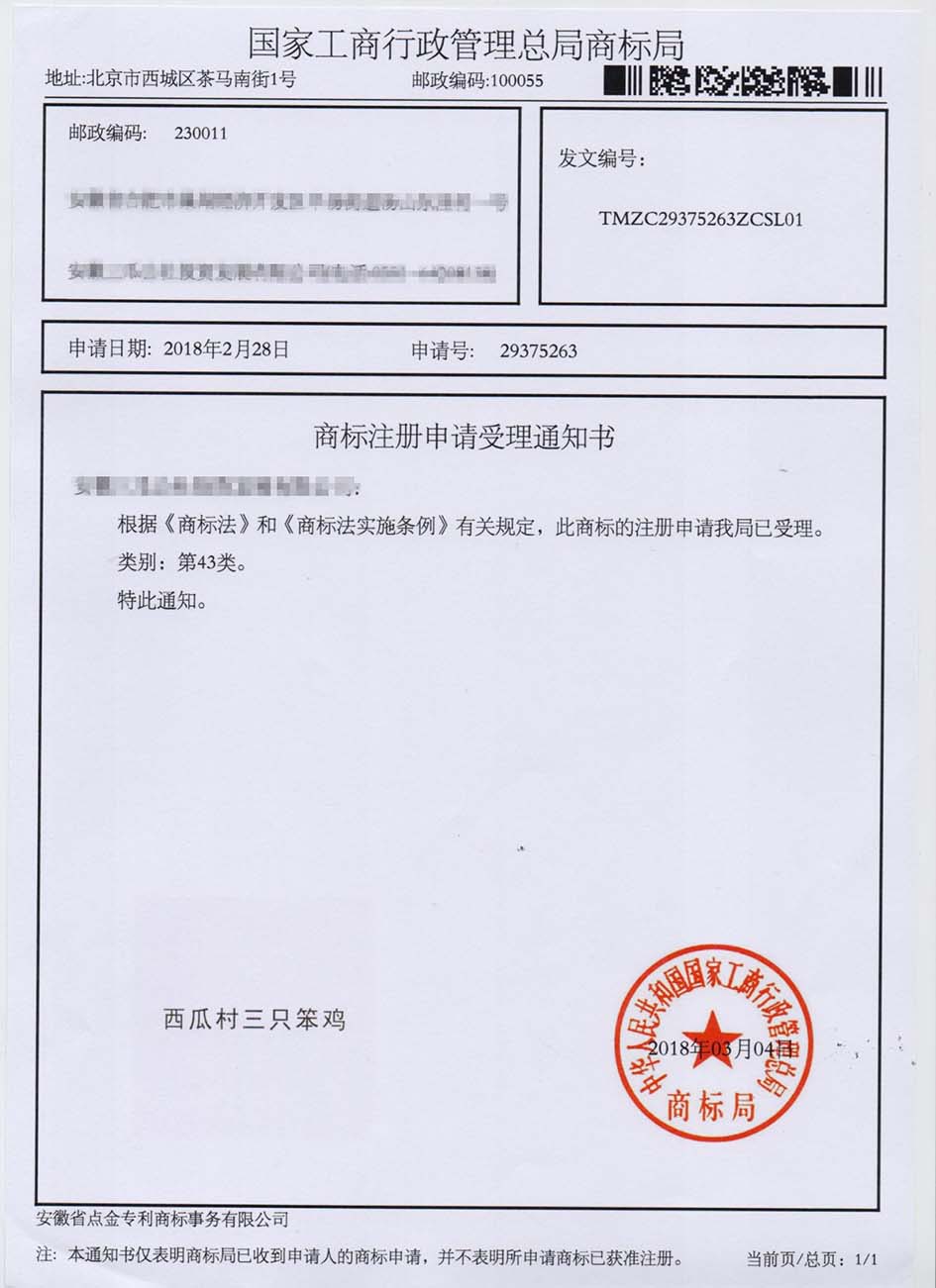 第43类“西瓜村三只笨鸡”商标受理通知书