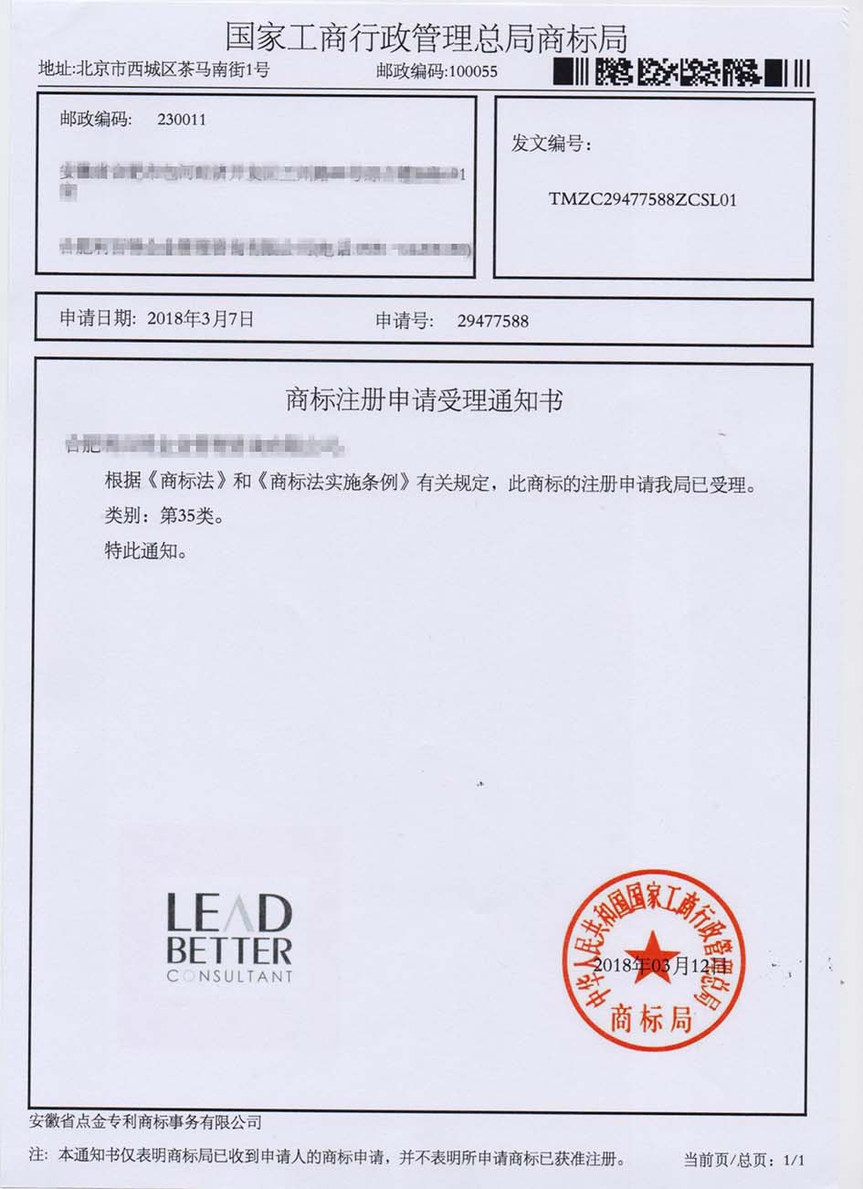 第35类“LEAD BETTER CONSULTANT”商标受理通知书