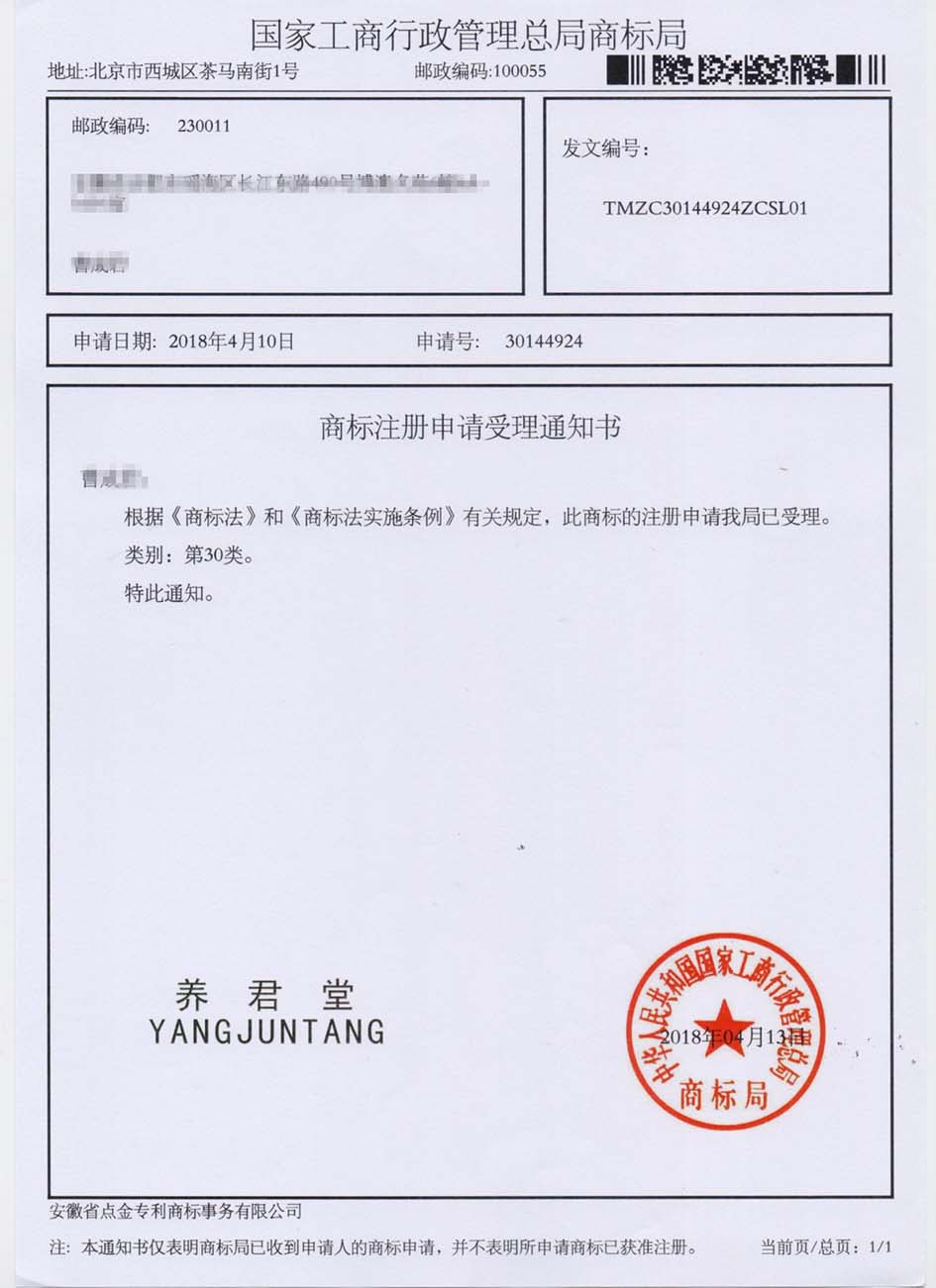第30类“养君堂”商标受理通知书