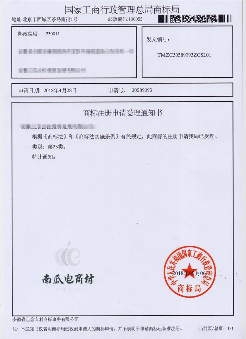 第25类“南瓜电商村”商标受理通知书