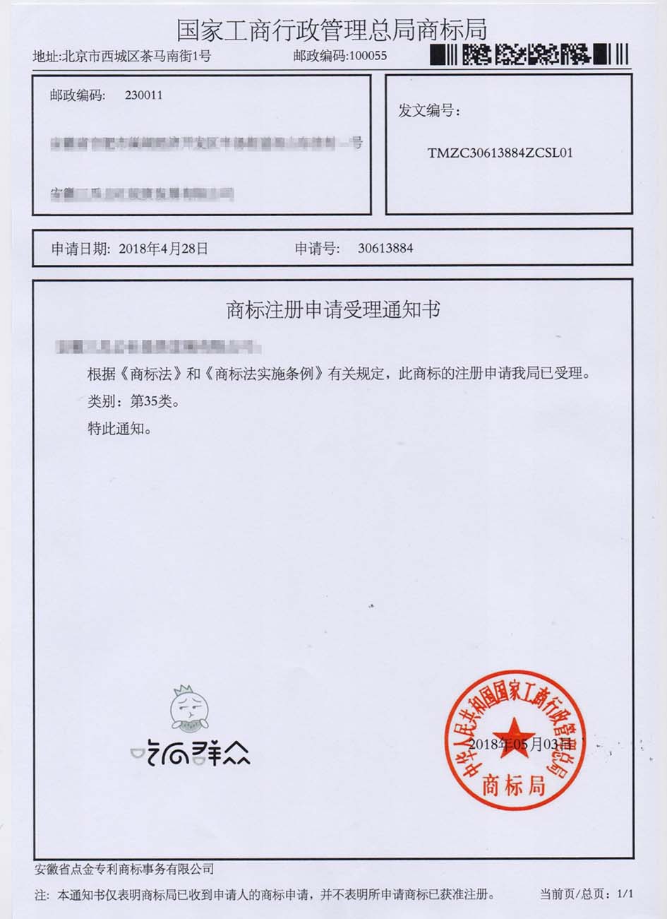 第35类“吃瓜群众”商标受理通知书