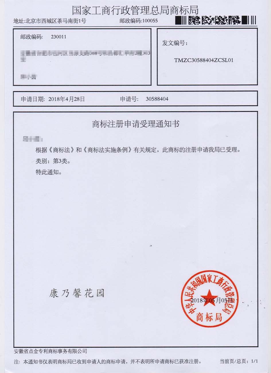 第3类“康乃馨花园”商标受理通知书
