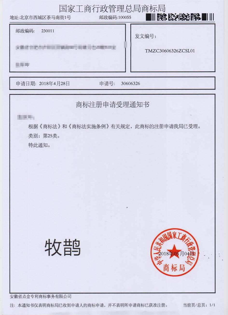第25类“牧鹊”商标受理通知书