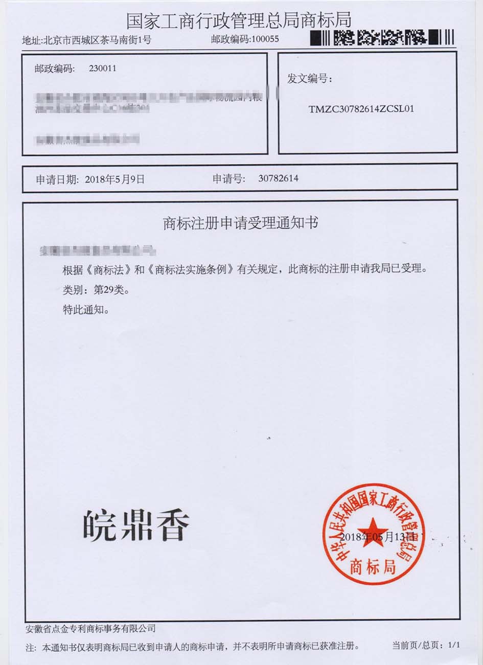 第29类“皖鼎香”商标受理通知书