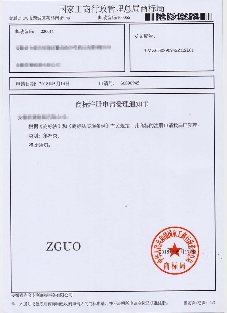 第25类“ZGUO”商标受理通知书