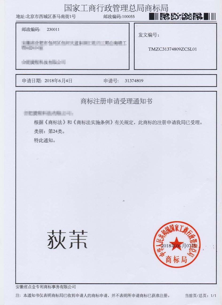 第24类“荻茉”商标受理通知书