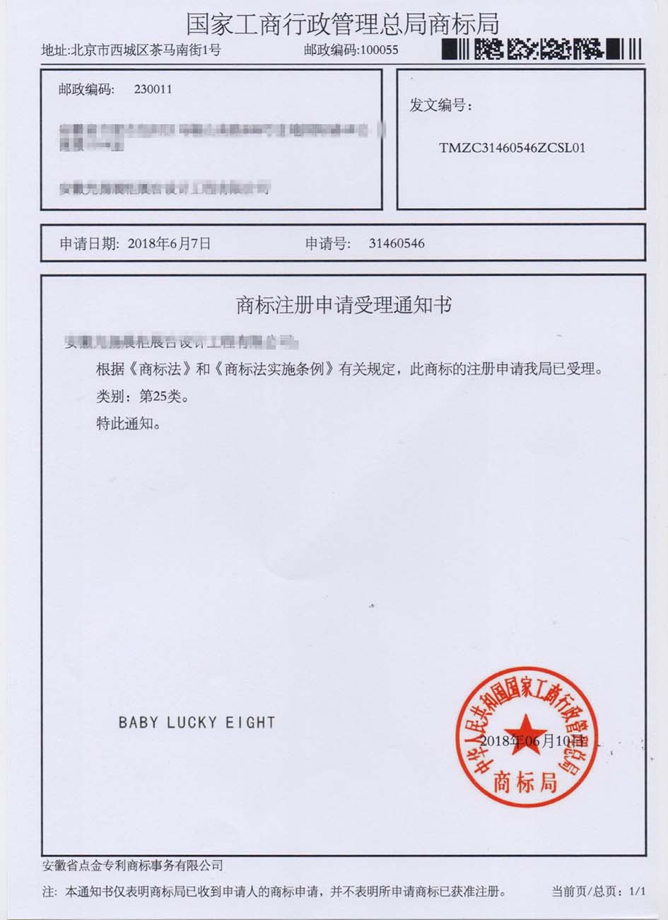 第25类“BABY LUCKY EIGHT”商标受理通知书