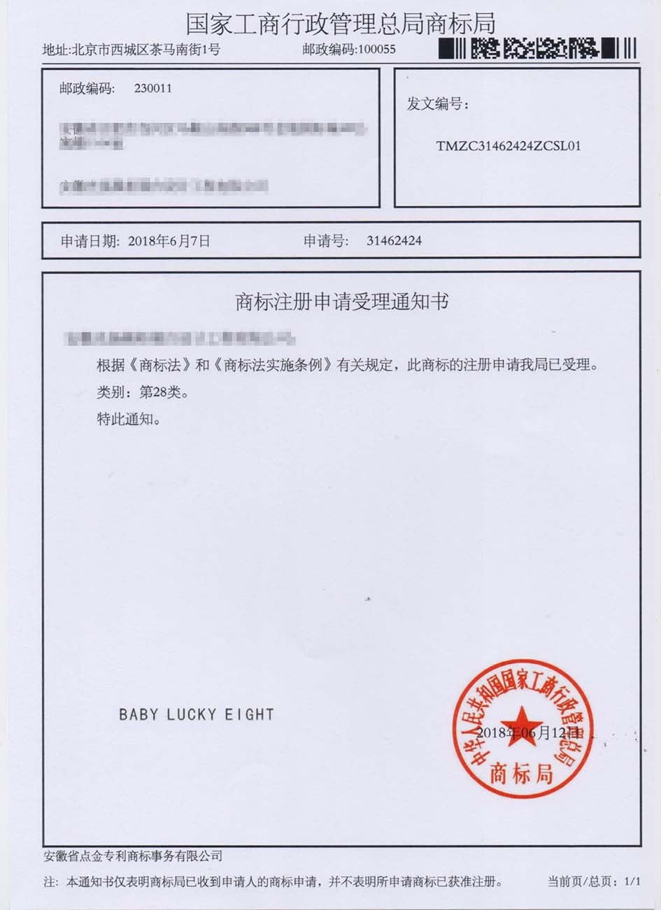 第28类“BABY LUCKY EIGHT”商标受理通知书