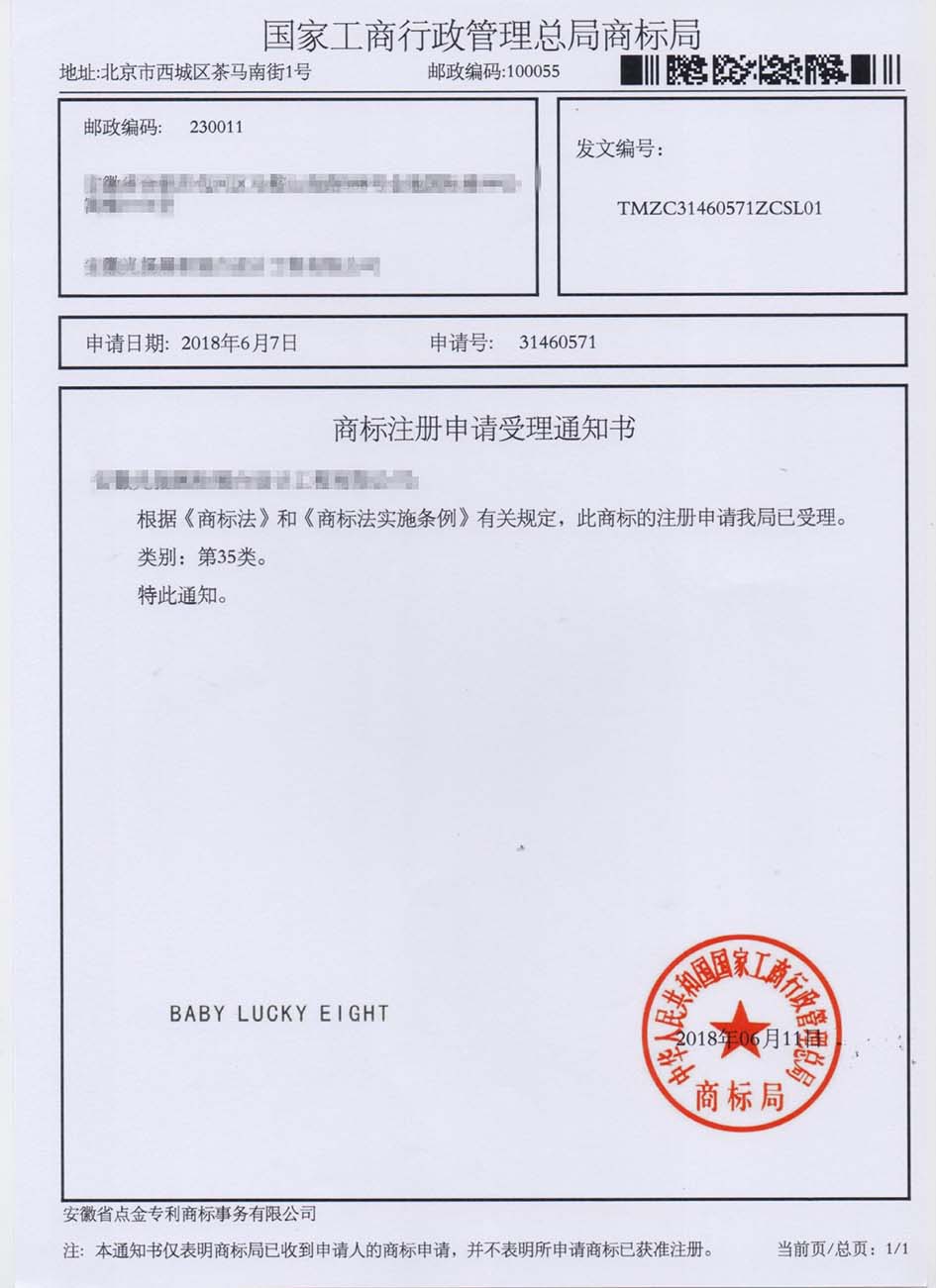 第35类“BABY LUCKY EIGHT”商标受理通知书