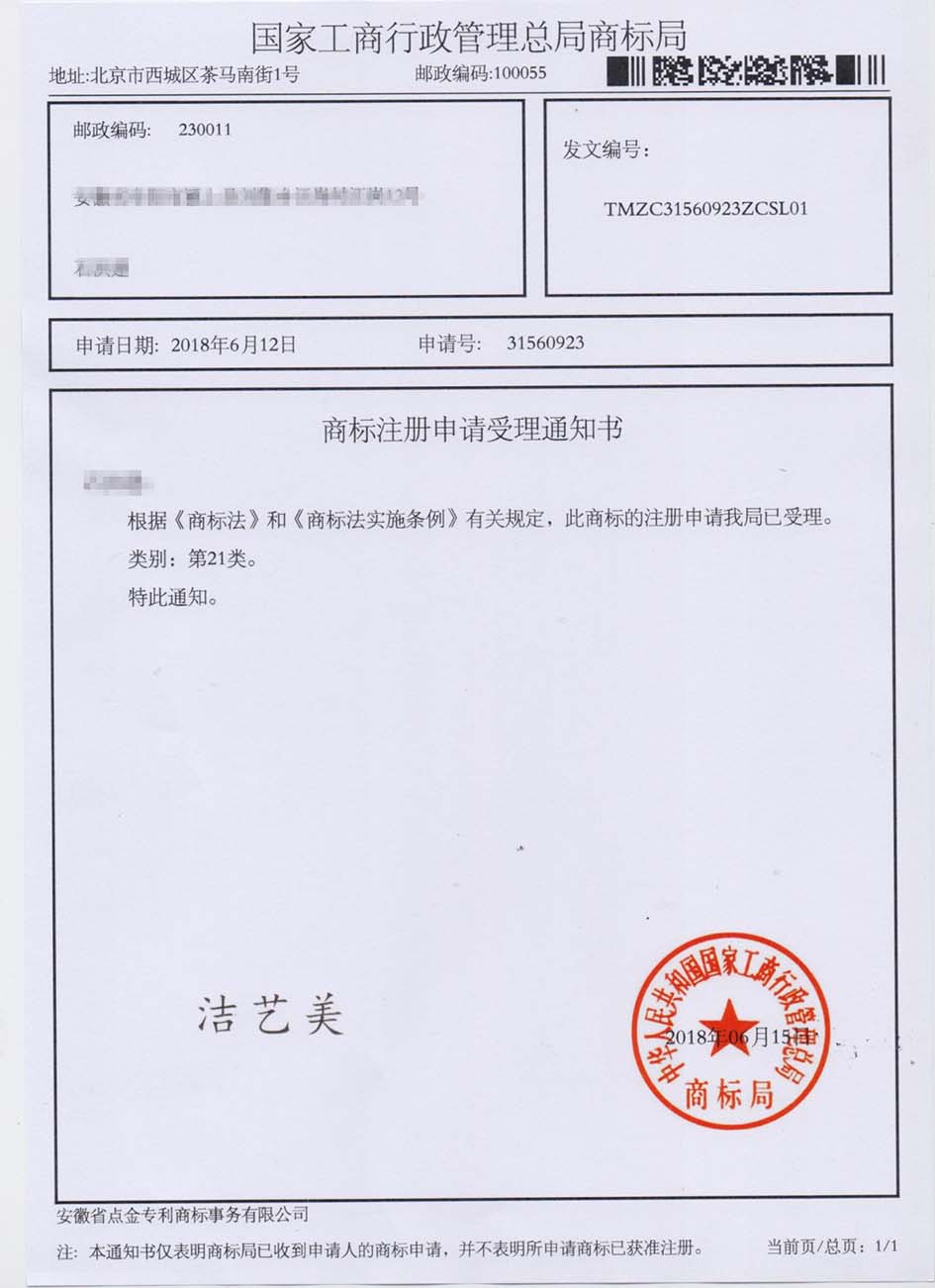第35类“洁艺美”商标受理通知书