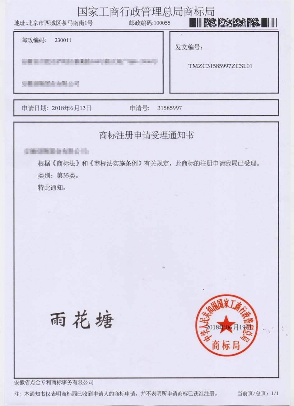 第35类“雨花塘”商标受理通知书