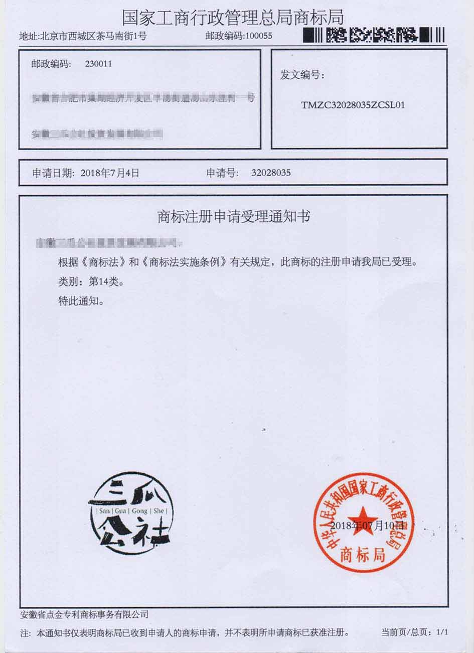 第14类“三瓜公社San Gua Gong She”商标受理通知书