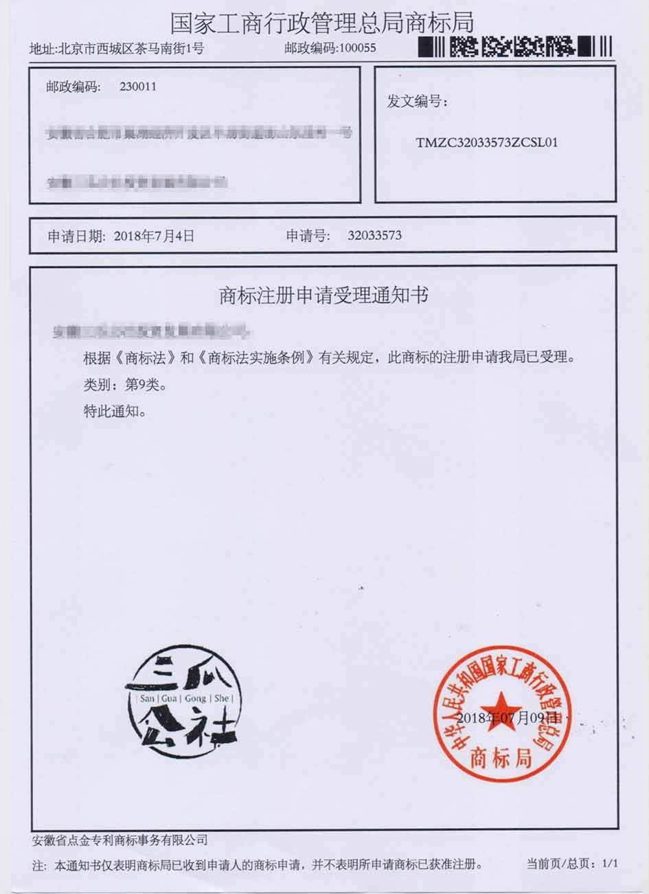 第9类“三瓜公社San Gua Gong She”商标受理通知书