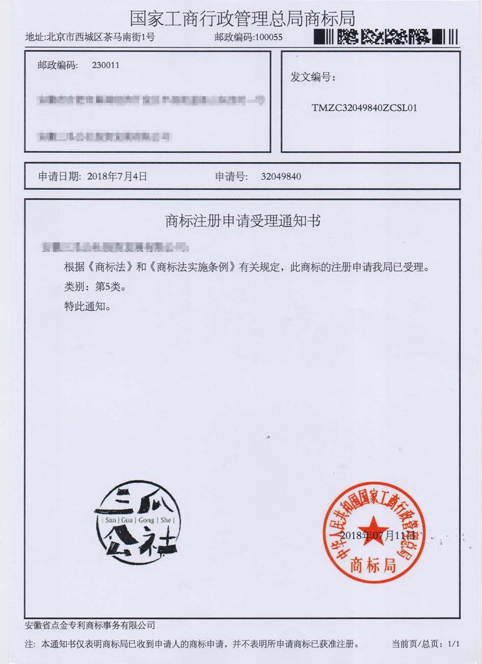 第5类“三瓜公社San Gua Gong She”商标受理通知书