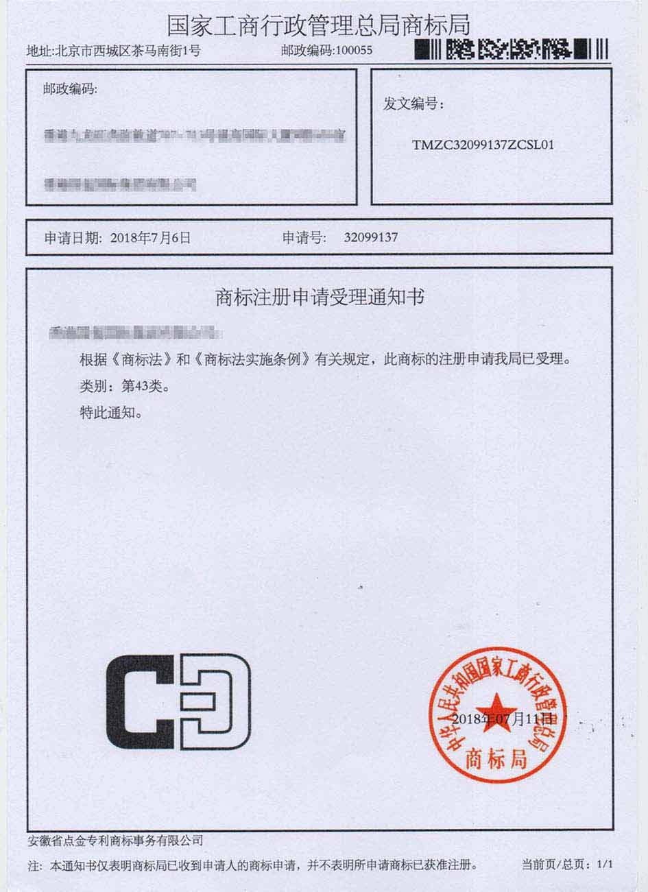 第43类“CD”商标受理通知书