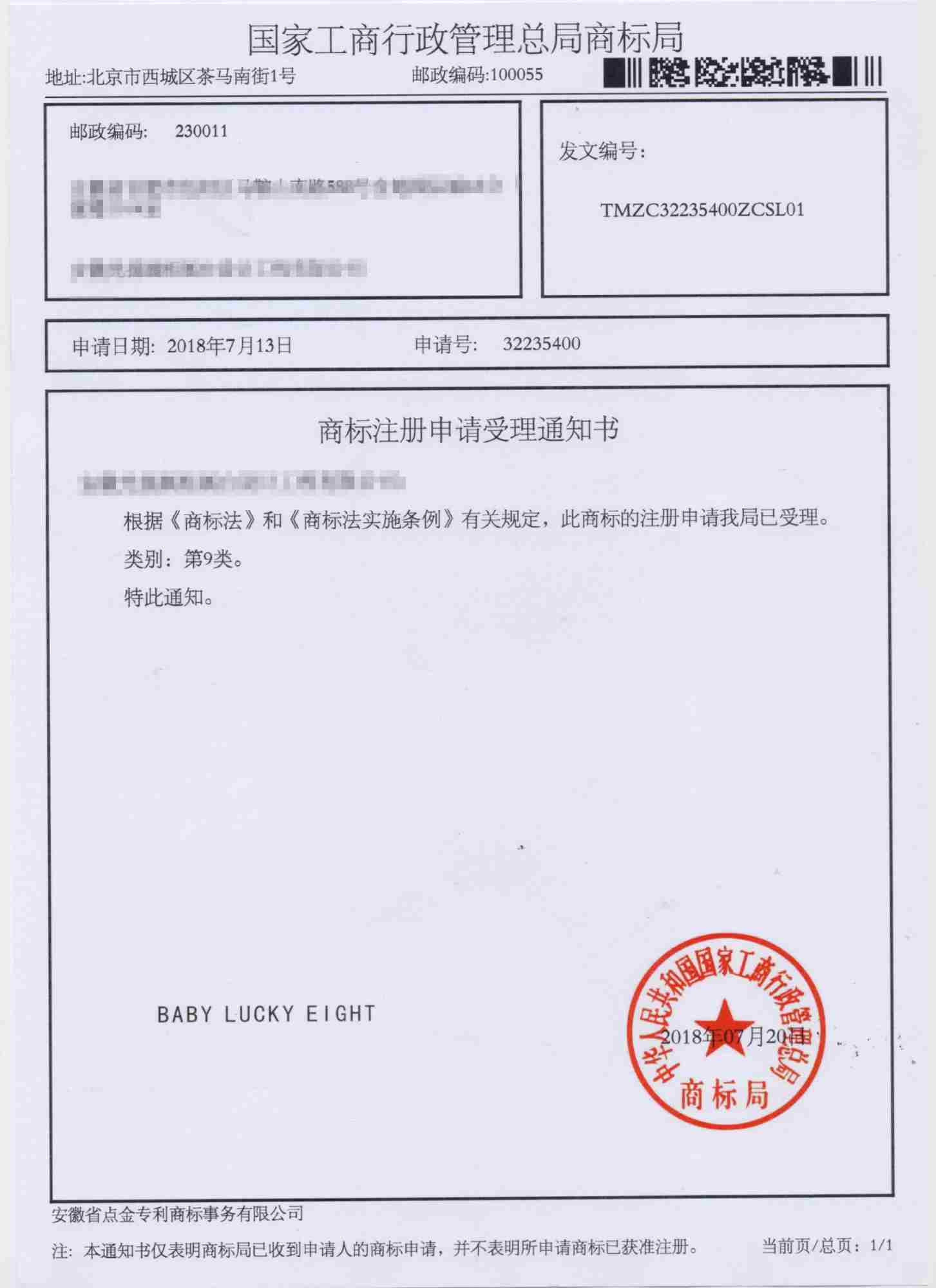 第9类“BABY LUCKY EIGHT”商标受理通知书