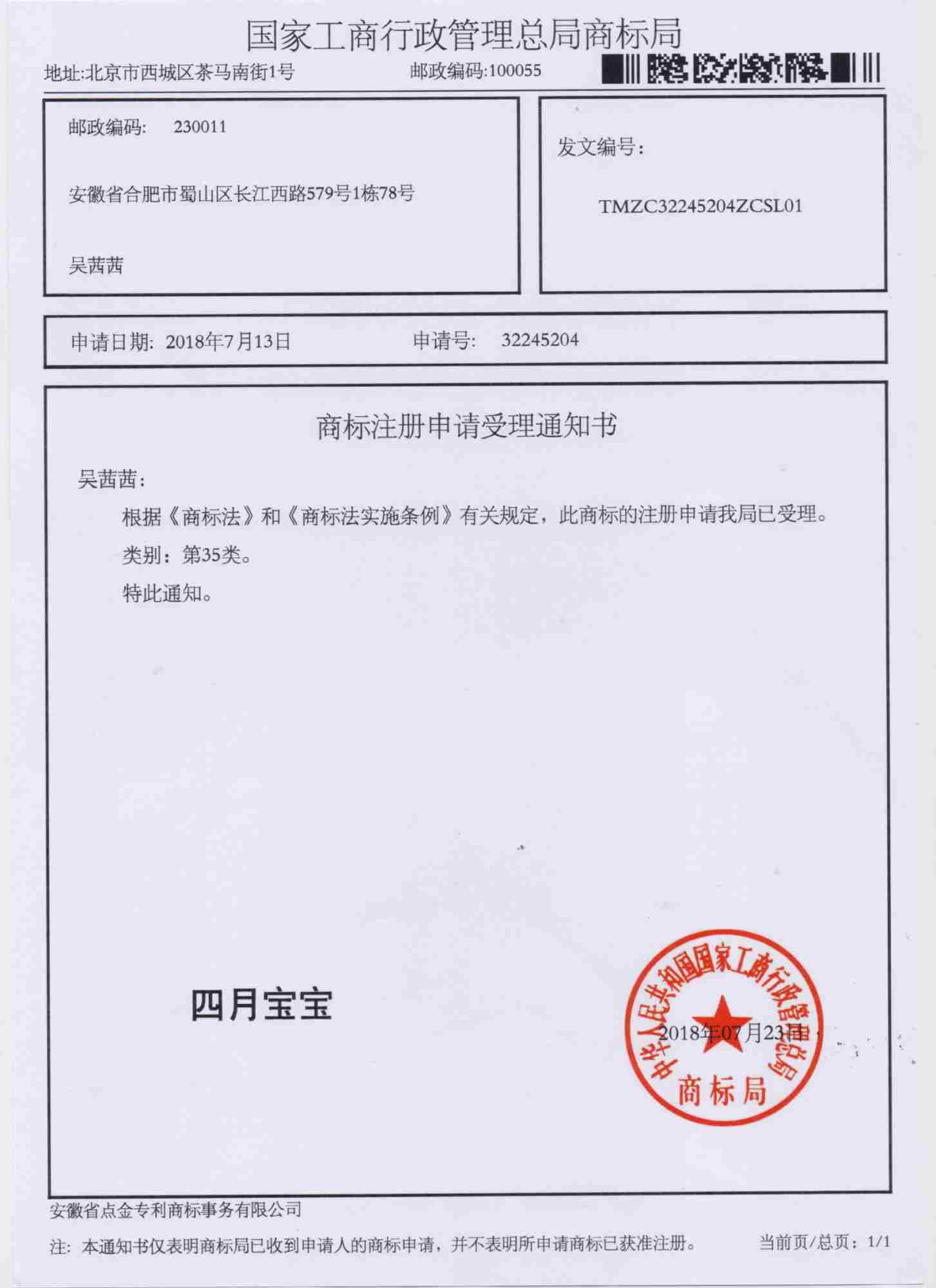 第35类“四月宝宝”商标受理通知书