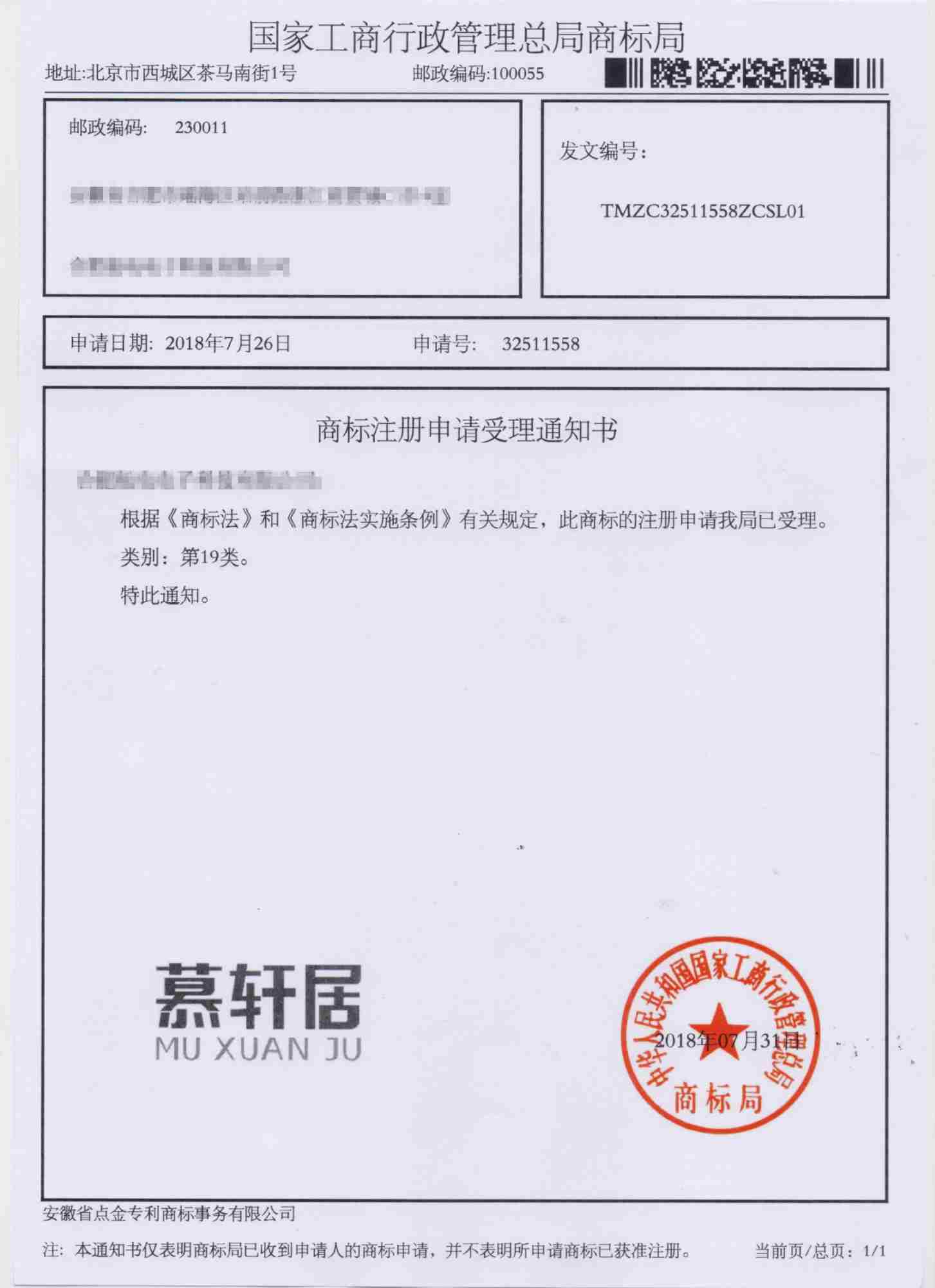第19类“慕轩居”商标受理通知书
