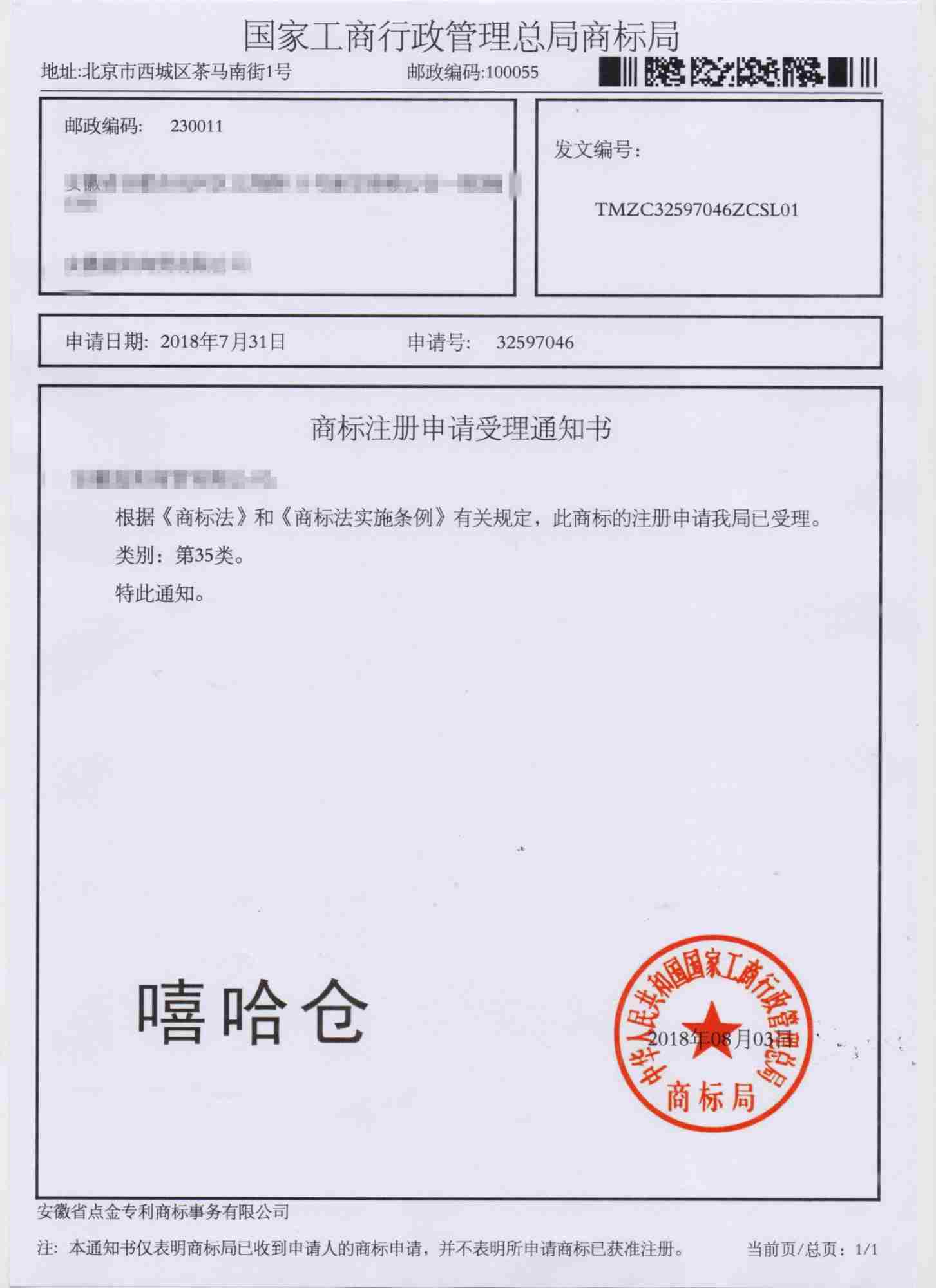 第35类“嘻哈仓”商标受理通知书