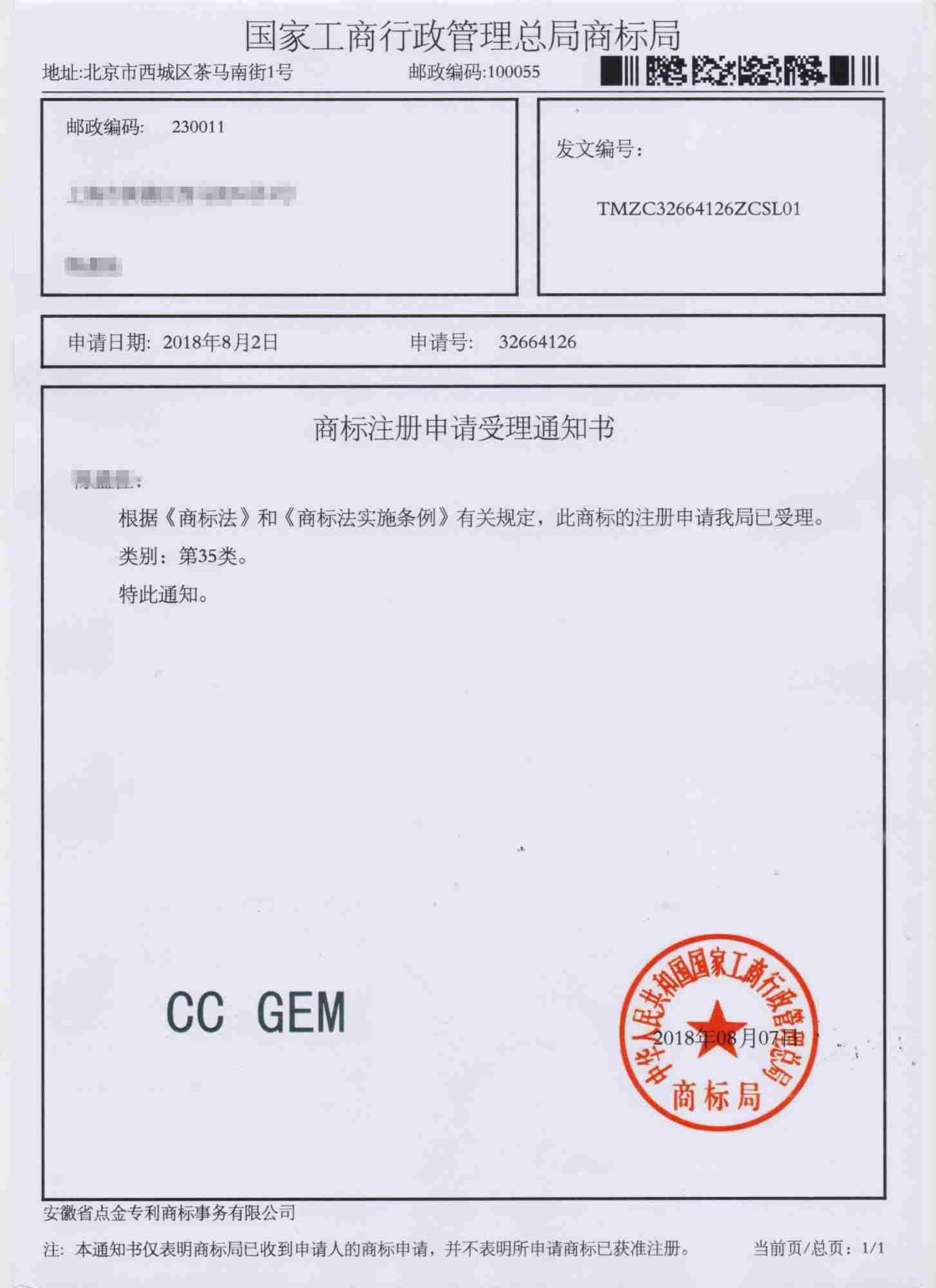 第35类“CC GEM”商标受理通知书
