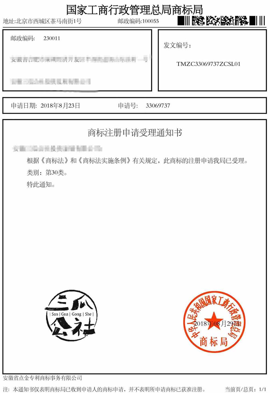 第30类“三瓜公社 SanGuaGongShe”商标受理通知书