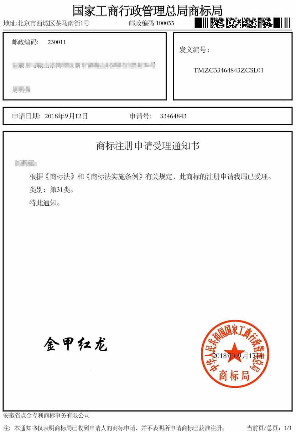 第31类“金甲红龙”商标受理通知书