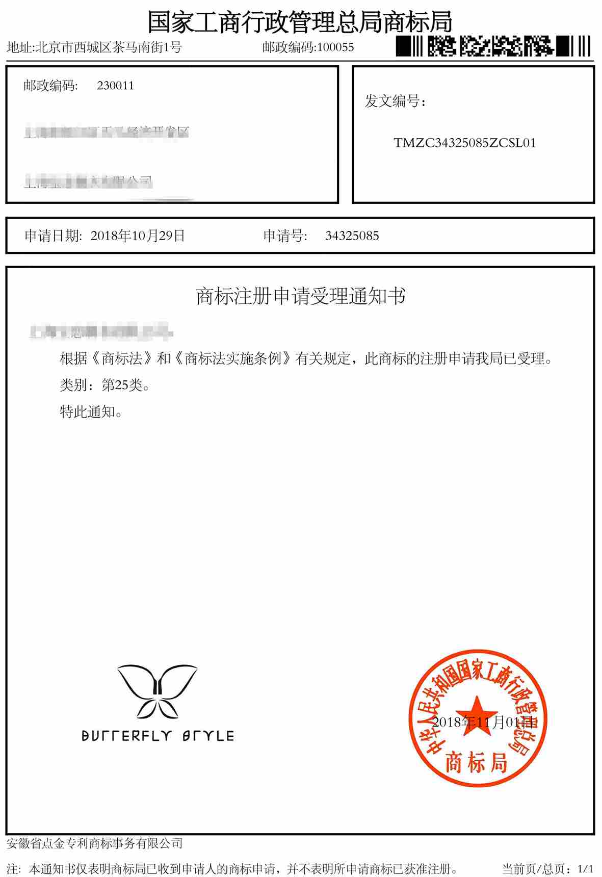 第25类“BURRERFLY BRYLE”商标受理通知书
