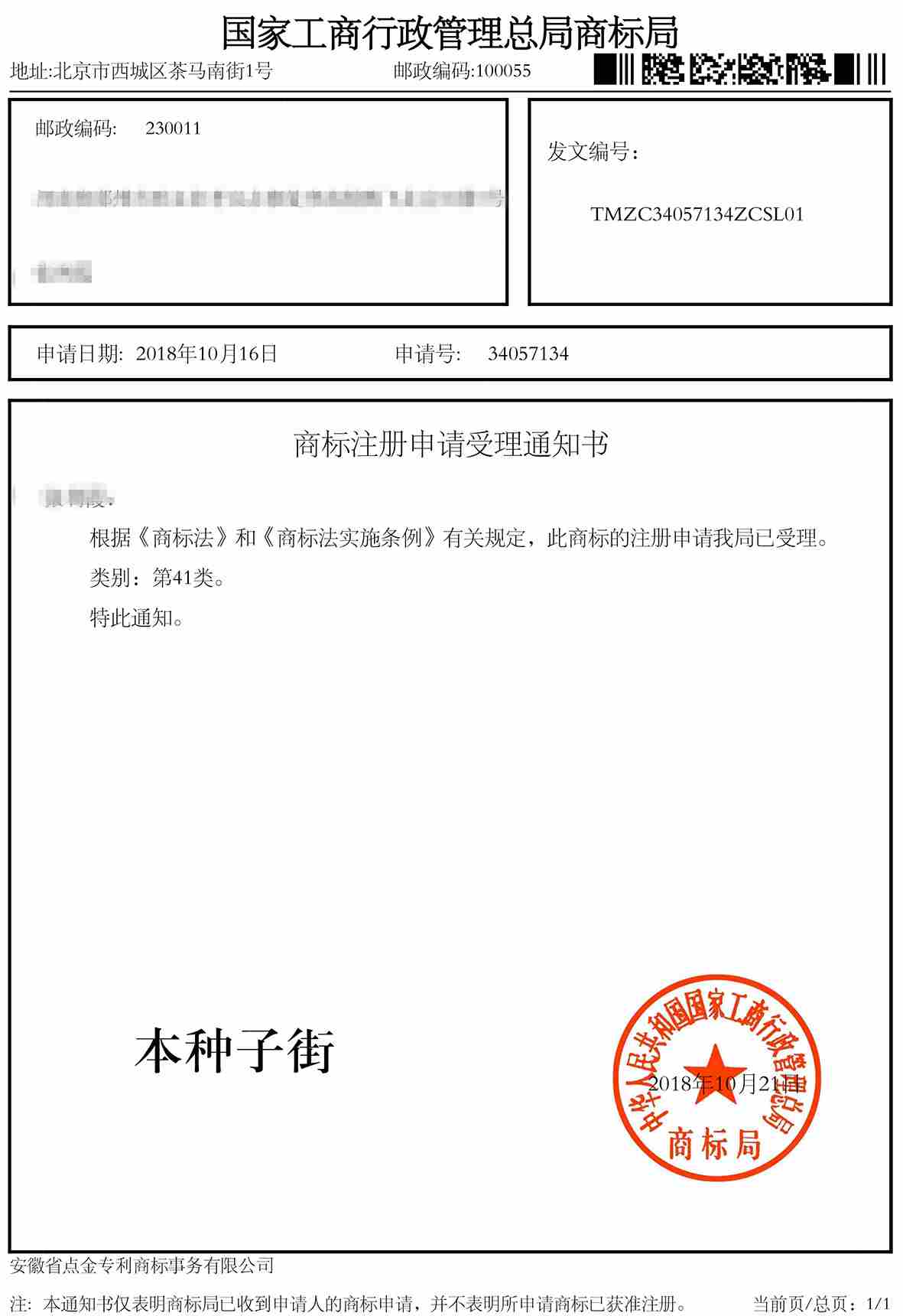 第41类“本种子街 ”商标受理通知书