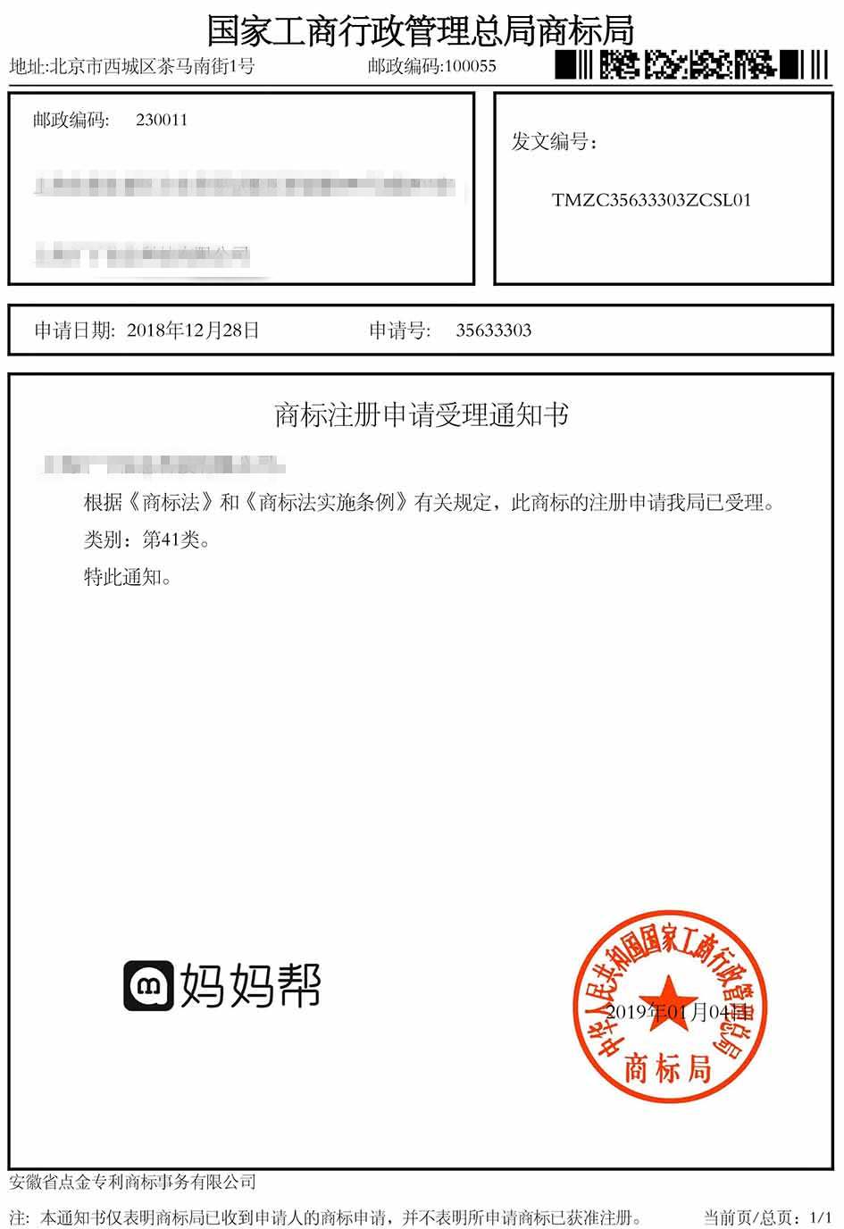 第41类“妈妈帮”商标受理通知书