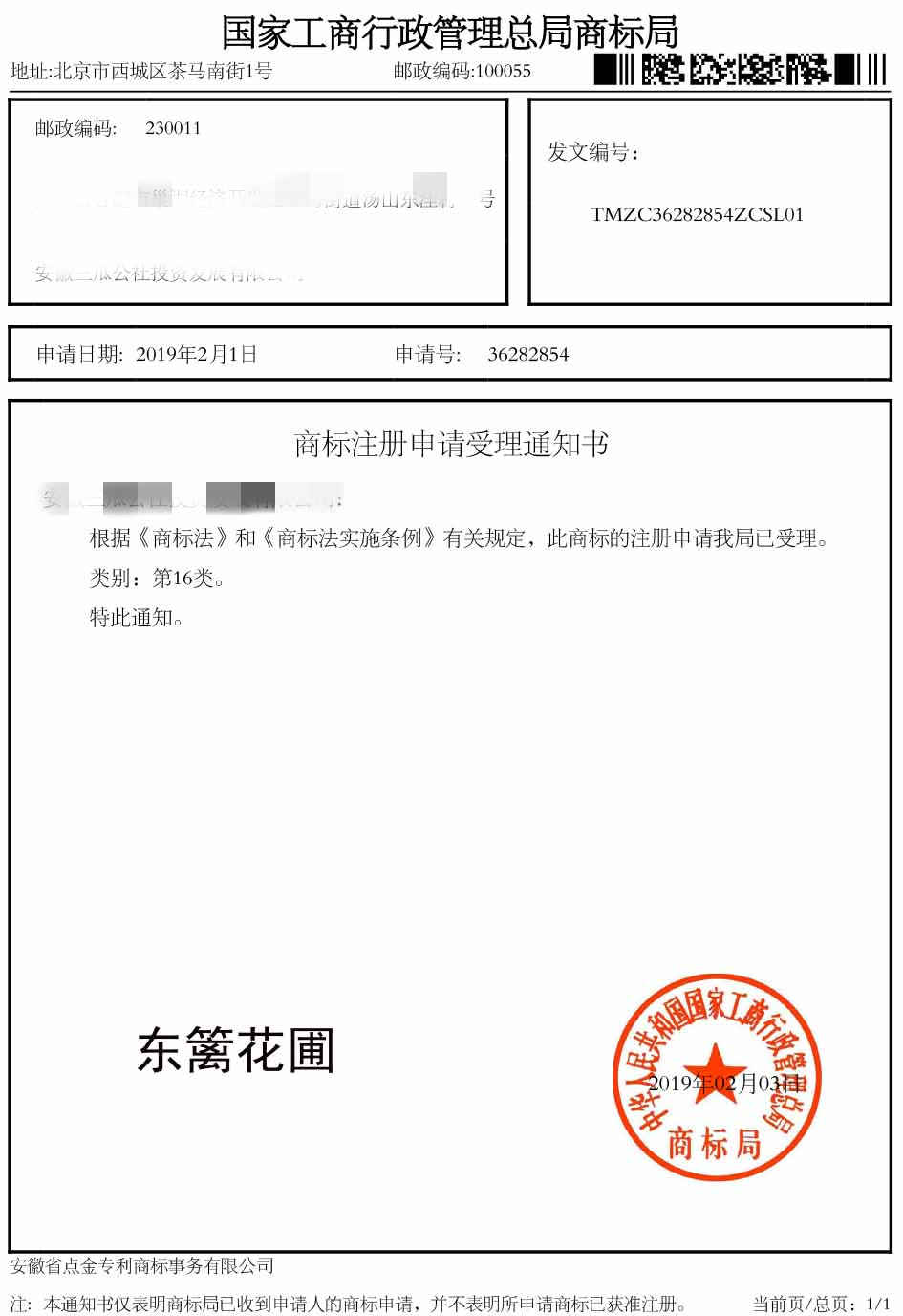 第16类“东篱花圃”受理通知书