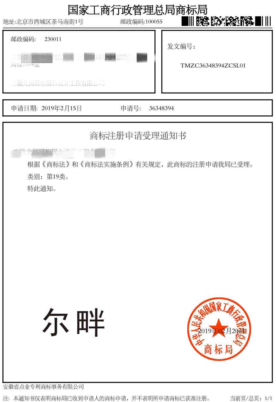 第19类“尔畔”受理通知书