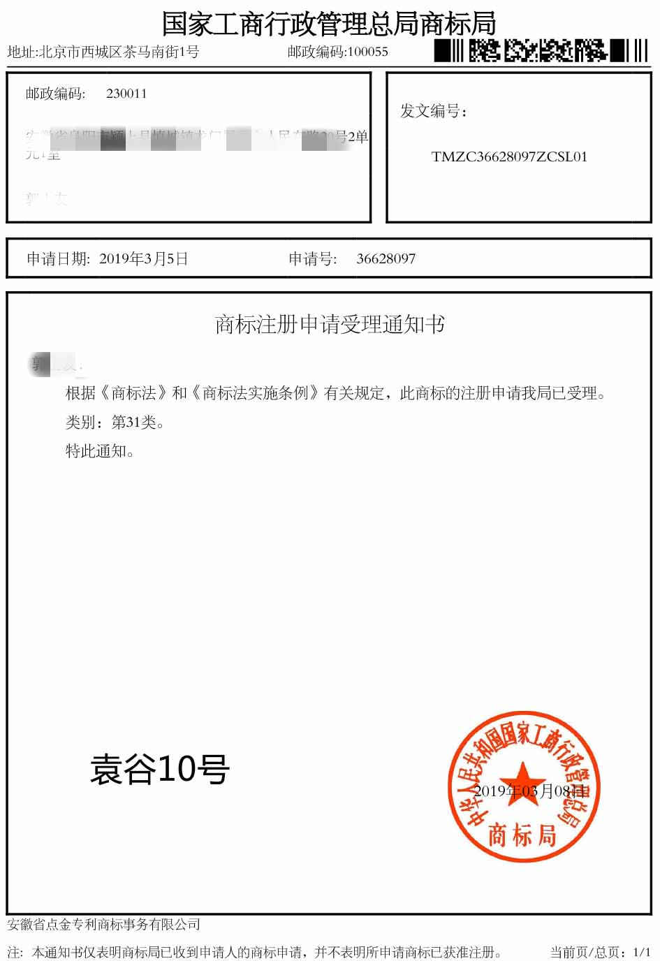 第10类“袁谷10号”受理通知书