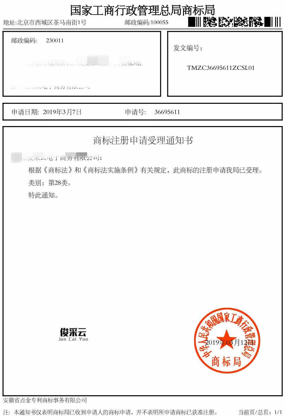 第28类“俊采云”受理通知书