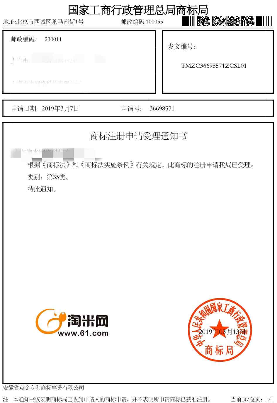 第35类“淘米网”受理通知书