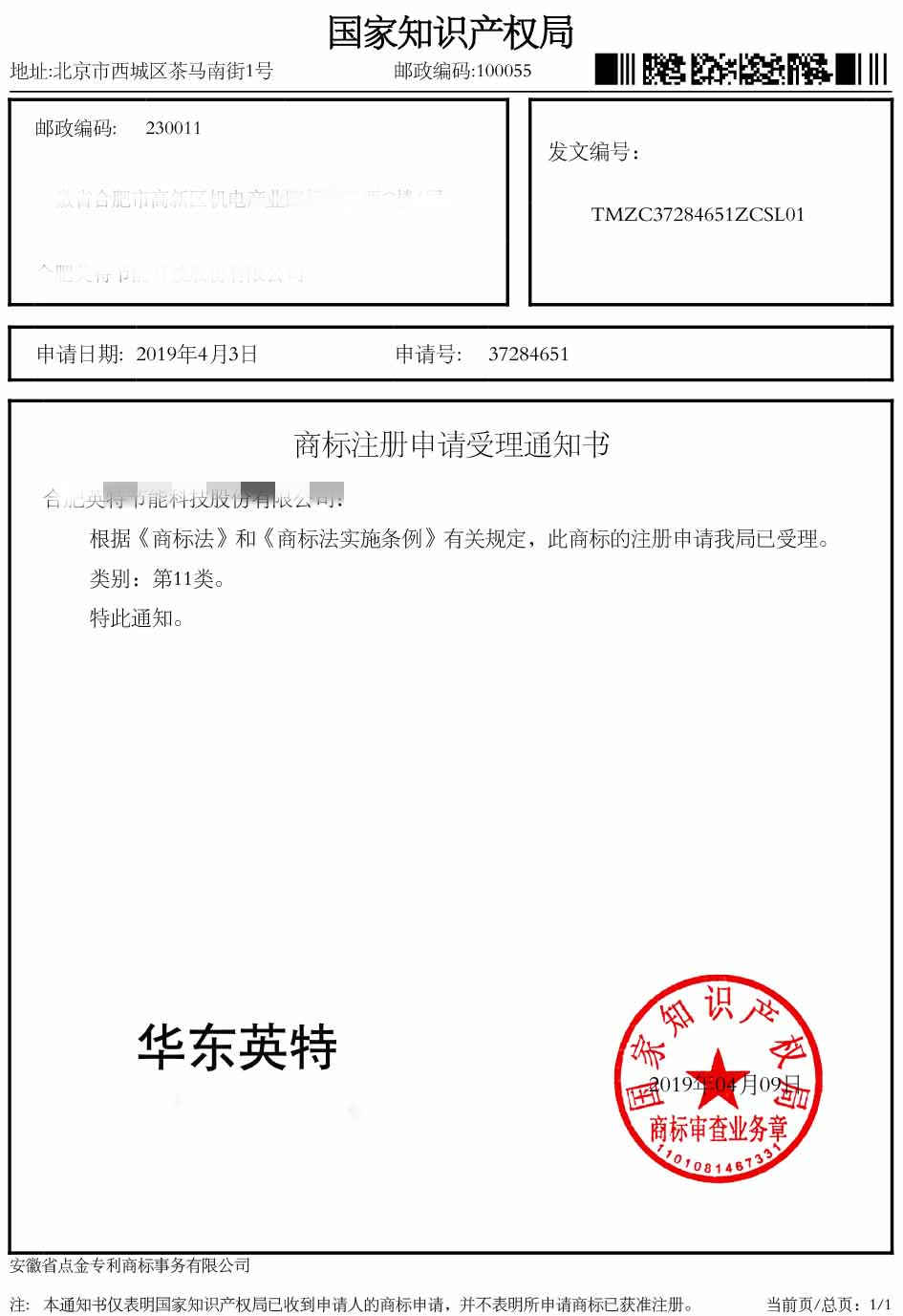 第11类“华东英特”受理通知书